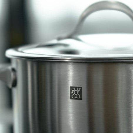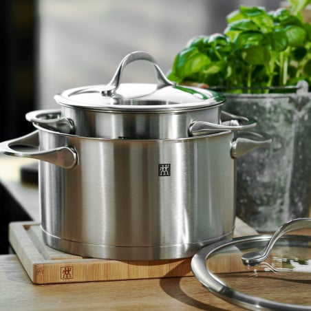 Elegantes ollas de acero inoxidable para una gran variedad de preparaciones, te presentamos la serie Essence de ZWILLING. El acero inoxidable, desde la base tipo sándwich hasta el mango, garantiza un aspecto elegante y también una muy buena conductividad térmica. La base sándwich con tecnología SIGMA Classic+ puede almacenar y distribuir muy bien el calor. Con tapas de vidrio que se ajustan con precisión. Bateria de cocina fabricada en acero inoxidable 18/10, tiene una base SIGMA Classic+. Apto para horno y lavavajillas.