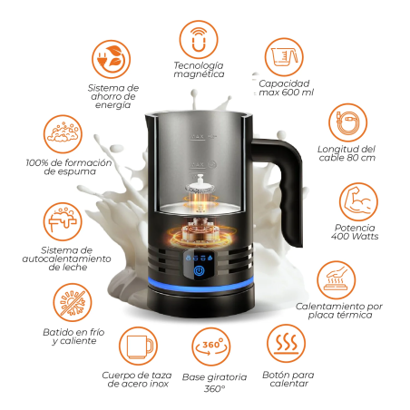 Con una capacidad máxima de 600 ml (400ml para calentar y 200 ml para espumar) Con un diseño elegante y acabados en acero inoxidable, el AeroFoam 4 en 1 combina innovación y estilo en tu cocina.