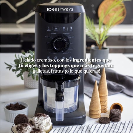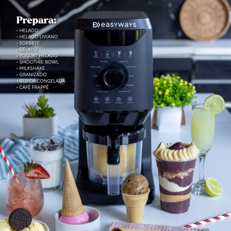Disfruta de helados y preparaciones frías más saludables y personalizadas desde la comodidad de tu hogar. Con la Máquina de Helado Easyways puedes elegir los ingredientes, controlar el azúcar y potenciar recetas más naturales para toda la familia. Incluye 3 bowls de Tritan de 500 ml con tapa, perfectos para conservar distintos sabores listos para disfrutar cuando quieras. Gracias a su innovadora función Top & Bottom, puedes preparar hasta dos sabores de helado en un mismo bowl. Además, cuenta con función de autolavado para una limpieza rápida y práctica. Con sus 10 funciones automáticas, tendrás variedad ilimitada en tu cocina: Helado Helado Liviano Sorbete Gelato Yogurt Helado Smoothie Bowl Milkshake Granizado Bebida Congelada Café Frappé No solo prepara helados: también puedes hacer granizados, tragos, açaí bowls y mucho más. Incluye recetario digital con ideas fáciles e inspiradoras. Potencia de 500 W y 1 año de garantía para que disfrutes con confianza. Características destacadas: Prepara helados saludables y caseros 3 bowls de Tritan de 500 ml con tapa Función Top & Bottom para 2 sabores en un mismo bowl 10 funciones automáticas Función de autolavado Recetario digital incluido Potencia 500 W 1 año de garantía