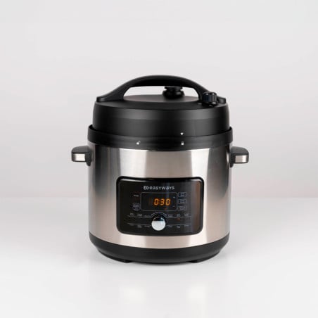 Fast Pot 5,7 L de EasyWays: olla multifuncional con 12 programas, incluyendo cocción a presión y cocción lenta hasta 24h. Inicio programado y modo conservar temperatura. Potencia de 1,000W y capacidad para 8 porciones. Incluye rejilla vapor.