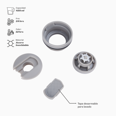 Diseñado para acompañarte en tu rutina diaria, con un formato compacto y 100 % hermético que se adapta a cualquier estilo de vida. Su tapa de doble pared con cierre de acero inoxidable evita derrames y mantiene la temperatura por más tiempo.