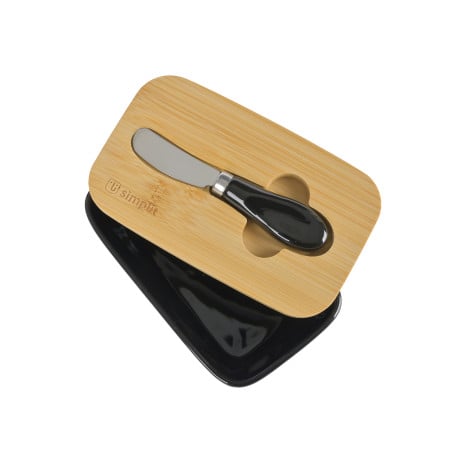 Mantequillero 600 ml Cerámica Negro con Tapa Bamboo + Cuchillo Simplit