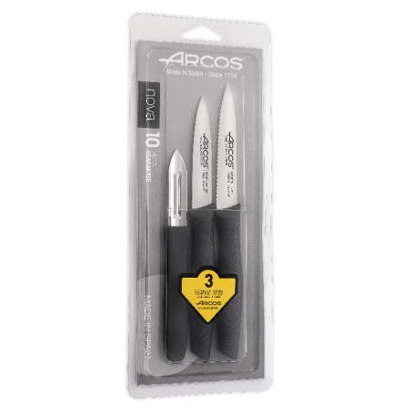 Set 3 Cuchillos Cocina 189700 Nova Arcos. Tres cuchillos: Un pelador de doble cuchilla lisa, mondador con filo liso de 85 mm y mondador de 100 mm con filo perlado. Diseñados y fabricados en España. Diseño ergonómico: Está fabricado en un tamaño pequeño que facilita el corte de los alimentos. Materiales de alta calidad: Ha sido elaborado por los expertos de Arcos, en Albacete, y cuenta con una hoja de acero inoxidable NITRUM®. Apto para lavavajillas. Aunque se recomienda su limpieza a mano.