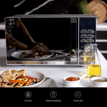 Microondas EasyWays Max Power 25 L – Potencia, estilo y funcionalidad para tu cocina El Microondas EasyWays Max Power 25 L combina diseño moderno con alto rendimiento para facilitar tu día a día. Su elegante acabado espejado le da un toque sofisticado a tu cocina, mientras su capacidad de 25 litros lo hace ideal para porciones grandes o comidas familiares. Con un panel digital de fácil uso y una perilla ergonómica, puedes controlar tiempo y potencia con total precisión. La función de auto descongelado optimiza la preparación de alimentos congelados, conservando su sabor y textura. Su interior antiadherente permite una limpieza rápida y sin esfuerzo, y con sus 1100 W de potencia, obtienes un calentamiento rápido, parejo y eficiente.