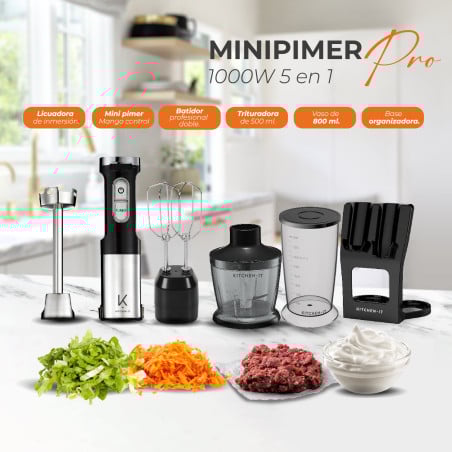 Con la Minipimer Pro 1000W 5 en 1 de Kitchen-it, transformar tu experiencia en la cocina nunca fue tan fácil. Este versátil dispositivo combina potencia profesional, diseño inteligente y una funcionalidad 5 en 1, ideal para quienes buscan practicidad sin renunciar a resultados de alta calidad.