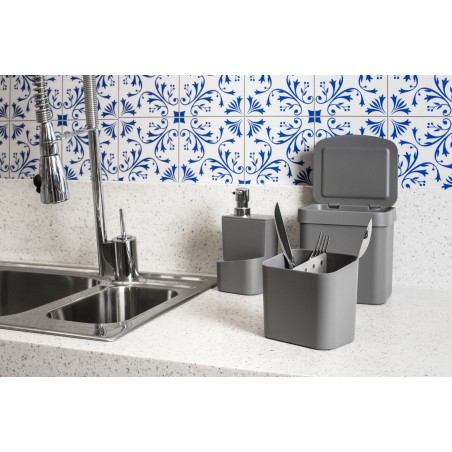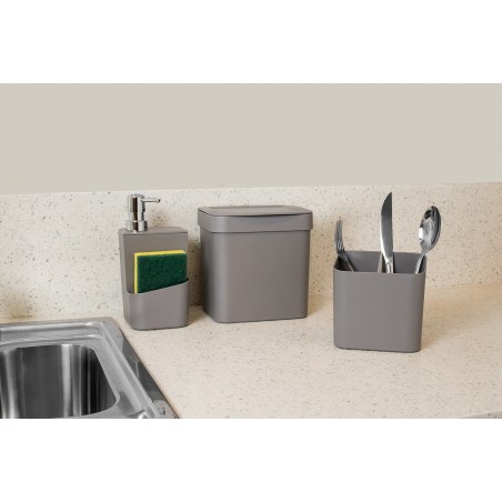Con un diseño minimalista, combina con todo tipo de cocinas gourmet o balcones. El dosificador tiene una válvula dosificadora que permite dosificar el detergente generando ahorro y un compartimento para guardar la esponja.