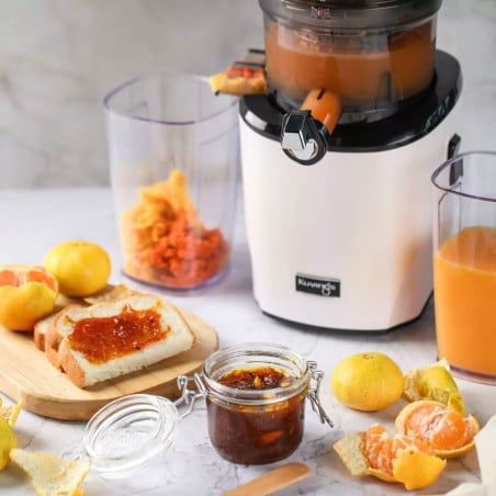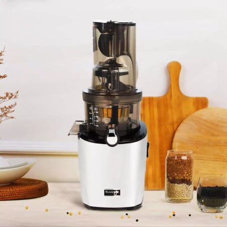 ¡Descubre la revolución en la preparación de jugos con el nuevo extractor Kuvings REVO830! ¡Nuevo sistema de auto-corte! Especial para verduras como el Apio y Zanahorias. Gracias a su sistema de prensado en frío, el extractor REVO830 evita la pérdida de nutrientes por calor, asegurando que obtengas jugos llenos de beneficios para tu salud. No te quedes atrás y sé uno de los primeros en disfrutar de esta innovadora experiencia en la preparación de jugos. Jugo revolucionario: disfruta de jugos saludables con el exprimidor lento completo Kuvings. Los conductos de tamaño doble y un diseño de corte sin cuchillas cortan y presionan los ingredientes, minimizando el desperdicio de alimentos y maximizando el rendimiento del jugo. Relájate y disfruta de tu bebida mientras la máquina hace todo el trabajo. Conductos extra anchos: introduce diferentes frutas y verduras en los conductos de dos tamaños. Un conducto extra grande de 3.5 pulgadas se adapta a ingredientes como manzanas, zanahorias, apio y remolacha. Además podrás hacer helados y leches de frutos secos. Ahorra tiempo en la preparación: alimenta las frutas enteras, corta las verduras e ingredientes largos y fibrosos directamente en el tornillo de corte automático, reduciendo así el riesgo de obstrucción antes de presionar. Los jugos de cada conducto se combinan para crear deliciosas y saludables mezclas. Mantén la frescura: el potente motor silencioso te permite cortar y extraer jugo de los alimentos sin que se oxiden ni se pongan marrones. Además, la salida más amplia facilita la limpieza y asegura un flujo sin esfuerzo tanto del jugo como de la pulpa. Una forma divertida de introducir frutas y verduras en la alimentación de los niños. Una marca confiable: durante 40 años, Kuvings se ha comprometido con la calidad en la que puedes confiar. Nueva Tolva de alimentación de 90 mm de ancho. Durabilidad Mejorada del Motor. Mecanismo de corte automático y exprimido. Jarras de diseño práctico. Salida de pulpa de nuevo tipo. Diseño de doble seguridad. Diseño elegante. Velocidad: 60 rpm Potencia: 200W Voltaje: 220-240 V CA, 50/60 Hz Peso: 7,5 kg Uso Máximo Menos de 30 minutos